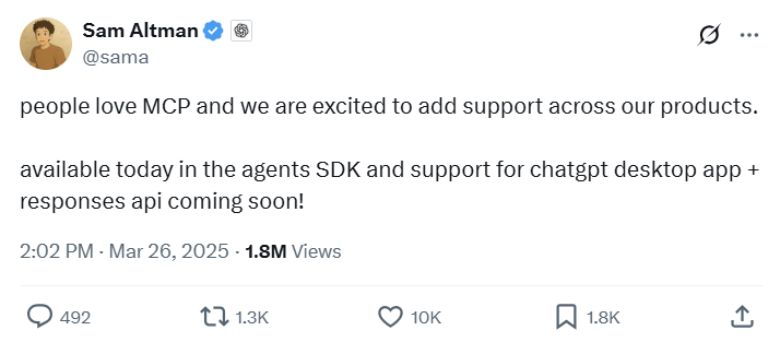 OpenAI officially announced MCP integration with its Agents SDK in March 2025, with CEO Sam Altman tweeting his enthusiasm for MCP. This put the hype into overdrive, as rarely do the Red Sox (Anthropic) & Yankees (OpenAI) agree to play nicely.