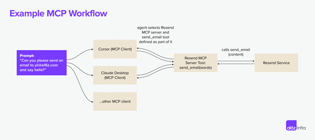 The protocol defines how the AI model can call external tools, fetch data, and interact with services. As a concrete example, below is how Resend, an AI-native email app for developers, uses its MCP server to orchestrate across multiple MCP clients.